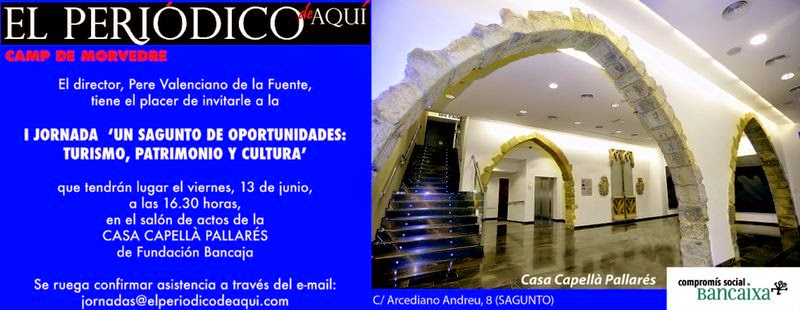 Pere Valenciano, vicepresidente primero de APPV, invita a nuestros socios a conocer mejor Sagunto y asistir al evento que organiza el medio de comunicación que dirige, El Periódico de Aquí. Nos referimos a la I Jornada ´Un Sagunto de oportunidades: turismo, patrimonio y cultura´. Tendrá lugar el viernes 13 de junio, a partir de las 16,30 horas.