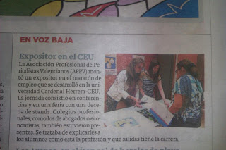 La Asociación Profesional de Periodistas Valencianos (APPV) participó en el «Maratón de empleabilidad» organizado por la universidad CEU. La jornada consistió en varias charlas sobre la realidad laboral y las posibles salidas profesionales. APPV participó poniendo un stand dónde se informaba a los alumnos de periodismo sobre los fines de la asociación y la necesidad de dignificar la profesión y frenar el intrusismo.