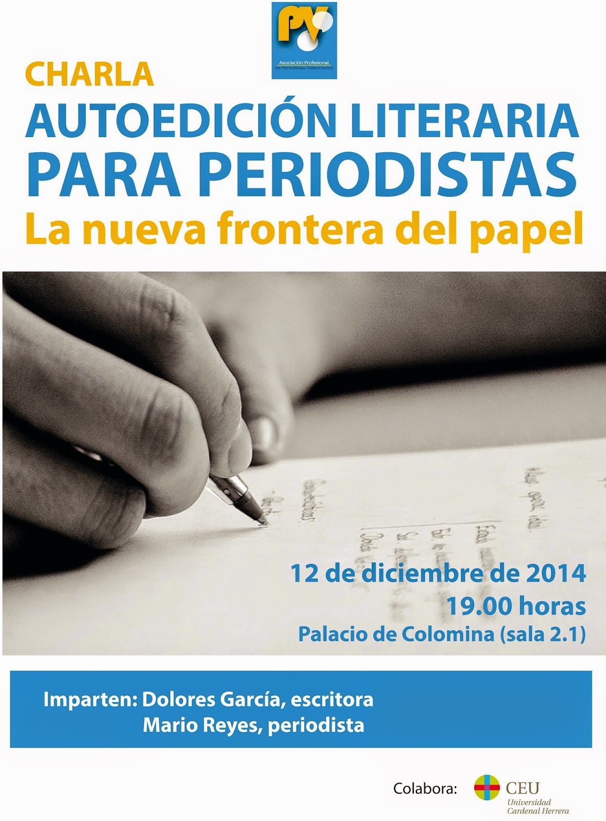 El próximo viernes día 12 de diciembre, a las 19 horas, APPV organiza una nueva charla. Podremos escuchar al periodista y escritor Mario Reyes y a la escritora Dolores García Ruiz hablarnos sobre ´Autoedición literaria para periodistas´, un tema apasionante y, por qué no, que también puede suponer una salida laboral. Será en la sala 2.1 que nos cede la Universidad Cardenal Herrera-CEU en el Palacio de Colomina en Valencia y la entrada es libre.