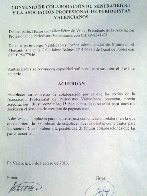 La empresa Mintrared SL y APPV han firmado un acuerdo de colaboración por el que los socios se pueden beneficiar de un 15% de descuento en el precio de la creación de su propia página web. Desde APPV animamos a conocer esta sociedad ya que han conseguido en sus productos conjugar a la perfección las particularidades de la prensa con las herramientas informáticas, una relación compleja que amenazaba con relevar al viejo pulso entre maquetadores y periodistas.Descuento en Páginas Web
