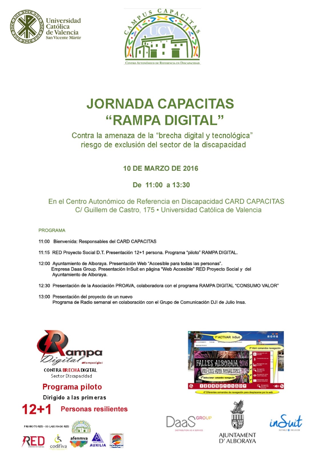 El alcalde de Alboraya, Miguel Chavarría, intervendrá durante la sesión donde se presentará el programa de accesibilidad web “InSuit”. Instalado recientemente en la página web del consistorio de l’Horta, facilitando así el acceso a la información a las personas con problemas de visión, cognitivos o desconocimiento del uso del ordenador.